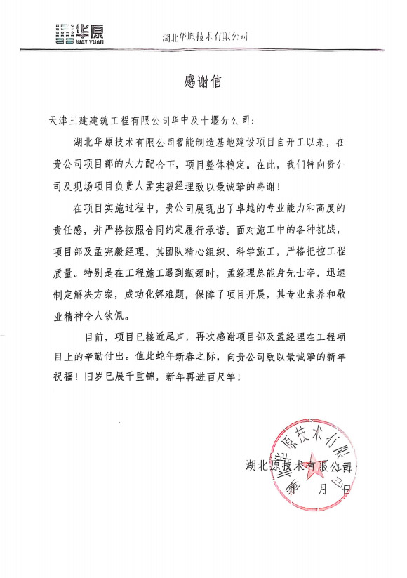 感 謝 信 天津三建建筑工程有限公司華中及十堰分么司: 湖北華原技術有限公司智能制造基地建設項目自開工以來,在責公司項目部的大力配合下,項目整體穩定。在此,我們特向貴公司及現場項目負責人孟憲毅經理致以最誠摯的感謝! 在項目實施過程中,貴公司展現出了卓越的專業能力和高度的責任感,并嚴格按照合同約定履行承諾。面對施工中...