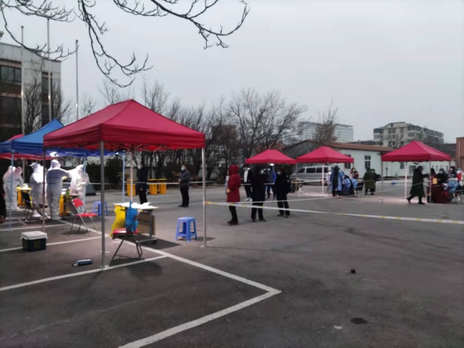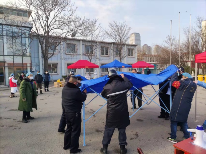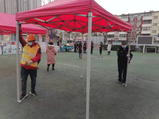 1月9日上午7時,天津三建公司接到河東區大直沽街緊急增援搭建核酸檢測點任務,三建公司反應迅速,按照應急預案立即抽調安保人員及河東分局農民工共16人分成三個組增援大直沽街文宮里社區、文華里社區和宮前里社區三個核酸檢測點位,協助社區搭建帳篷、施劃一米間隔線、拉設分割警戒帶、布設照明及設施用電,快速圓滿的完成了增援任務。同時,三建公司為文宮里轄區居民提供了一處檢查篩查點,連夜協助社區做好各項篩查準備工作,并為工作人員解決了物資儲存、人員休息及飲用熱水的保障工作,今晨7時順利的迎來了第一批檢測居民。企業的增援和保障工作得到了各社區及街道的高度認可,為天津的抗疫做出了三建貢獻。