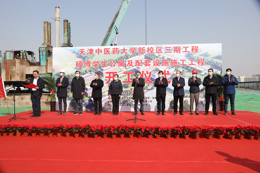 2022年3月3日,在一片彩旗飄揚和熱烈的歡呼中,由天津三建建筑工程有限公司總承包施工的天津中醫藥大學新校區三期工程碩博學生公寓及配套設施工程舉行了簡約而隆重的開工典禮儀式。該工程總建筑面積4.45萬平方米,由碩博學生公寓及附屬用房等十二個樓座組成,該工程的開工建設,瞄準國家實施建設世界一流大學和一流學科建設的“雙一流”總體戰略,弘揚中醫文化和中醫醫學走向世界提供有力支撐。