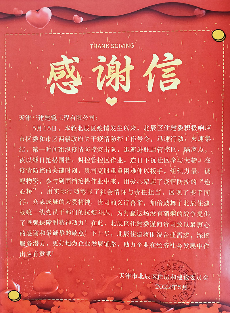 感謝信——天津市北辰區住房和建設委員會