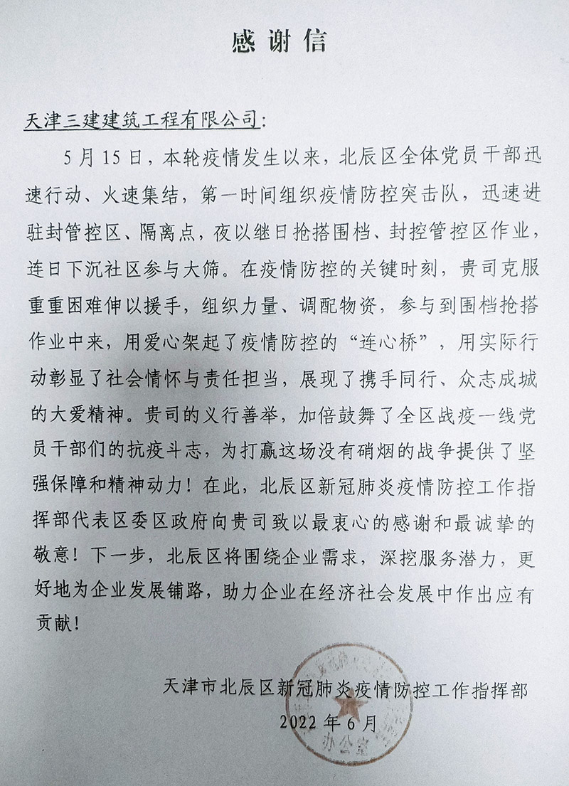 感謝信——天津市北辰區新冠肺炎疫情防控工作指揮部