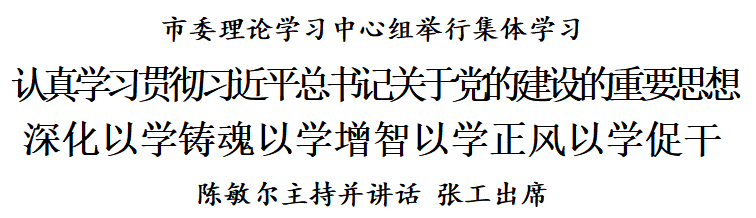 根據(jù)我市主題教育工作安排,市委常委同志認(rèn)真學(xué)習(xí)領(lǐng)會習(xí)近平總書記關(guān)于黨的建設(shè)的重要思想,關(guān)于嚴(yán)肅黨內(nèi)政治生活的重要講話和重要指示批示精神,關(guān)于以學(xué)鑄魂、以學(xué)增智、以學(xué)正風(fēng)、以學(xué)促干等重要論述,關(guān)于樹立和踐行正確政績觀的重要論述,學(xué)習(xí)習(xí)近平總書記對天津工作“三個著力”重要要求和一系列重要指示批示精神,學(xué)習(xí)黨章、新形勢下黨內(nèi)政治生活若干準(zhǔn)則、縣以上黨和國家機(jī)關(guān)黨員領(lǐng)導(dǎo)干部民主生活會若干規(guī)定等黨內(nèi)法規(guī)。會上,市委常委同志結(jié)合思想和工作實際交流了學(xué)習(xí)體會。